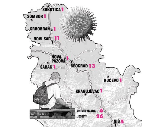 Četrdeset obolelih doputovalo je iz zemalja u kojima su se zarazili, a preostalih 28 zarazili su se u kontaktu sa obolelima. Među njima je i šestoro sportista sa Univerzijade, poreklom iz Australije, Argentine, Ugande, Zambije i Francuske, kao i još 26 osoba koje su bile na „Egzitu" (10 državljana Britanije, jedan državljanin Makedonije, dva državljanina Kanade i 13 srpskih državljana).